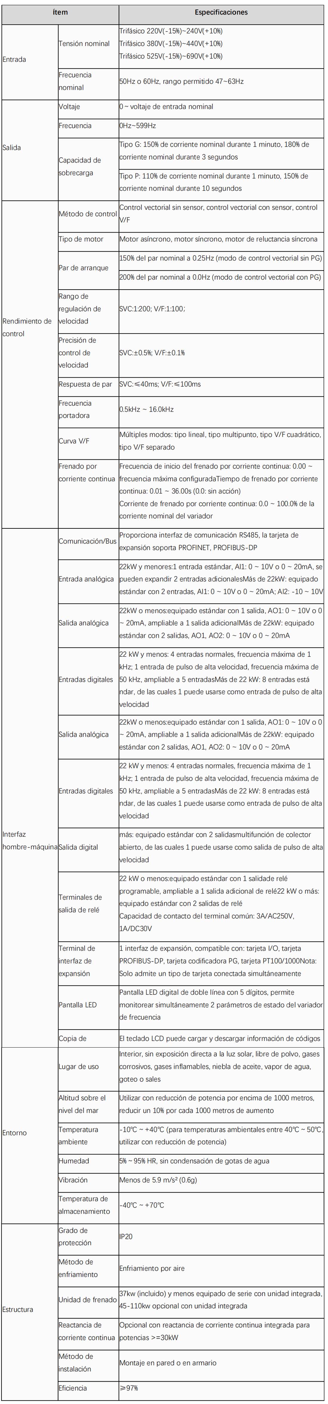 - Alto par a baja frecuencia: SVC: 0.5Hz/150%; FVC: 0.0Hz/180%, mejora el rendimiento de control a baja velocidad del equipo.