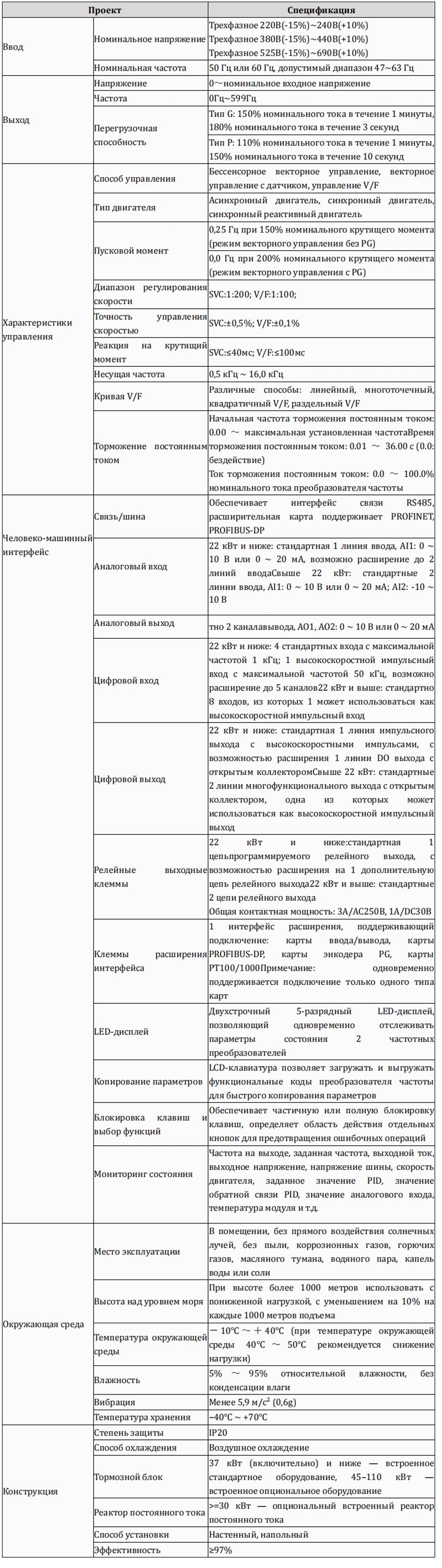 - Большой крутящий момент на низких частотах: SVC: 0.5 Гц/150%; FVC: 0.0 Гц/180%, что улучшает управление оборудованием на низких скоростях.